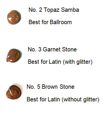 Color No 2 Topaz Samba This heightened brown tone with diamond gold pearl adds an outstanding, sexy sheen to your to your skin. Recommended for Ballroom dancers who do not need to tan the skin very dark. Color No 3 Garnet Stone is the Deep Brown body foundation with golden pearl shade gives the skin a natural- looking healthy suntanned glow. With the beautiful diamond pearl pigments, this Dance Tanning Make Up gives you sensational shiny look under the stage light. Once the tanning make up dries up on your skin, it doesn't smudge under water or sweat and doesn't easily stain the garments. It is easy to cleanse with soap or foaming cleanser. Recommended for Latin dancers who tan the face darker than Ballroom dancers. Color No 5 Brown Stone is the same colour as No.3 Garnet Stone, however without any golden pearls (without any glitter). Recommended for Latin dancers who tan the face darker than Ballroom dancers. For larger areas where faster application is important we also recommend Sex Symbol Aerotan which is a very similar product, but it is in spray. How to Use Aery Jo Tanning Make-up PREPARATION Do not apply Tanning Make Up when your skin is sweat or the body is hot, as the tan won't dry properly. The skin must be clean and dry before applying. APPLYING Rub Quickly and Widely - When you apply it on your back, squeeze the liquid enough to fill your partner’s palm. When you apply it on your arms and legs, squeeze it to fill 1/4 of your palm. Apply it by using your hand because your palm is warm. Rub quickly and widely to avoid smudge. DRYING It takes 15 - 20 min to dry. You can however use a hairdryer to shorten this time. After it is dry, you can wear the clothes and the tan will not stain them even if you sweat a lot! CLEANSING Cleansing - Easy to Clean with Soap or Foaming Cleanser and water. Should there be any leftovers wipe them out with Eye make-up remover. |