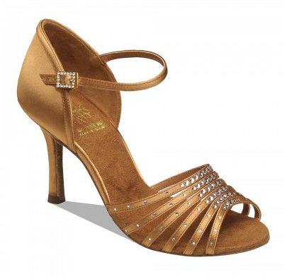 Style 1071 Dark Tan satin Price £115.00 excl.VAT Multi strap sandal with Swarovski crystals in Dark Tan Satin. Square Crystal Hook Buckle. Choice of 2.5" flare or 3" stiletto heel. |