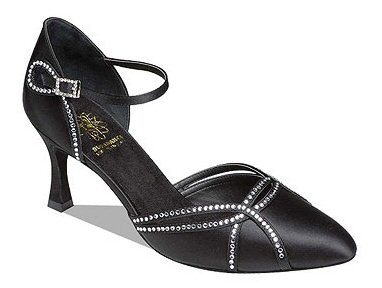Style 1543 Black satin Price £125.00 excl.VAT With Genuine Swarovski Crystals. Square Diamond Hook Buckle. 2" flare heel. |