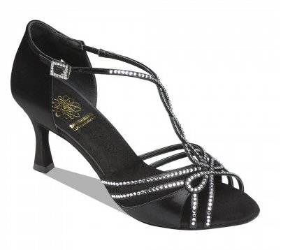 Style 1542 Black satin Price £125.00 excl.VAT With Genuine Swarovski Crystals. Square Diamond Hook Buckle. 2.5" flare heel. |