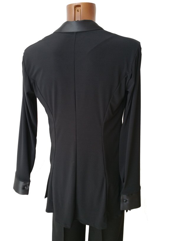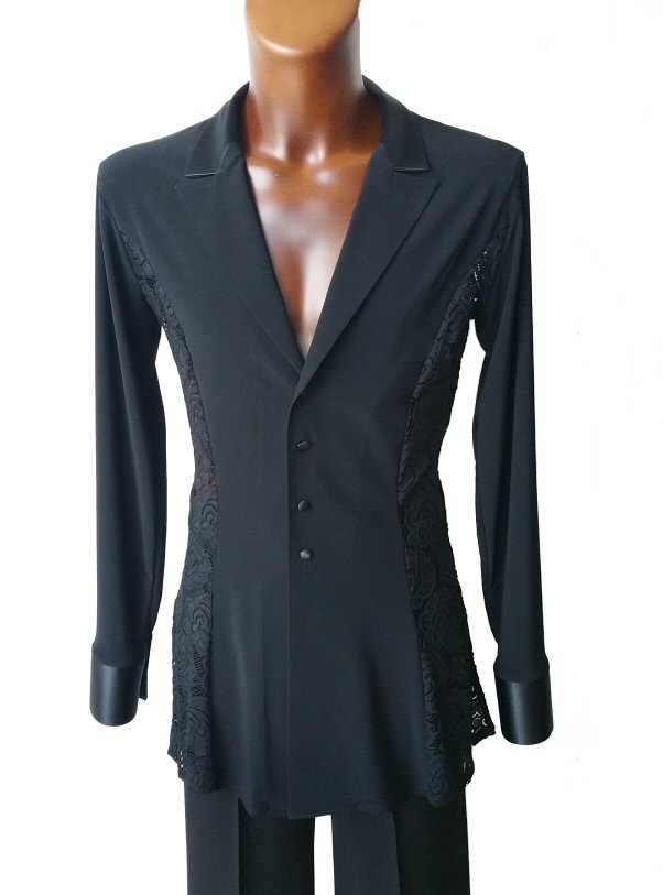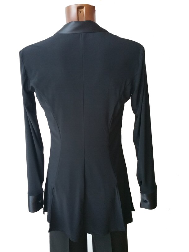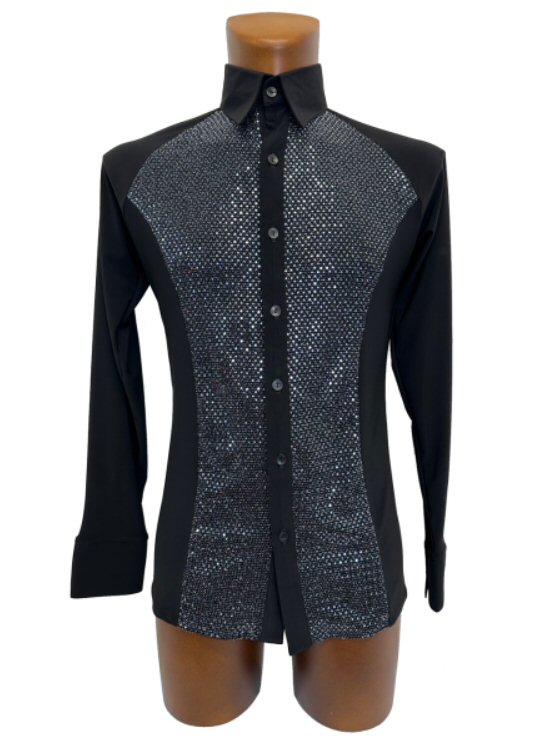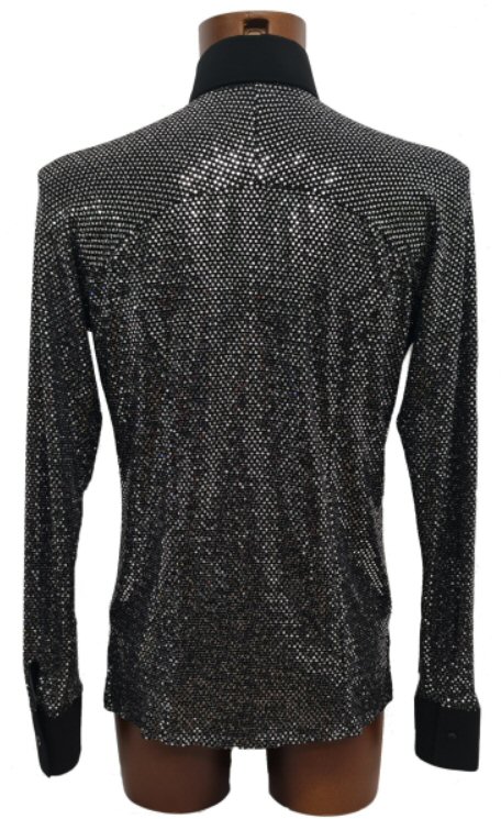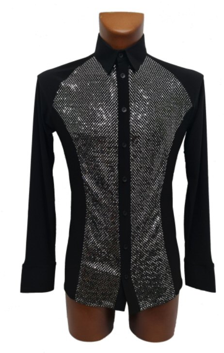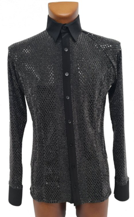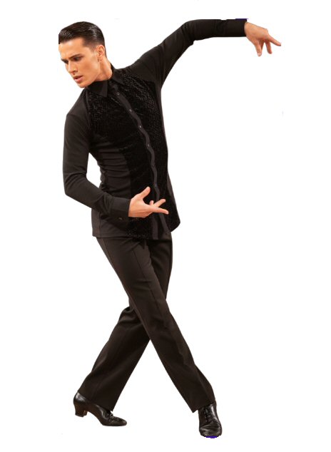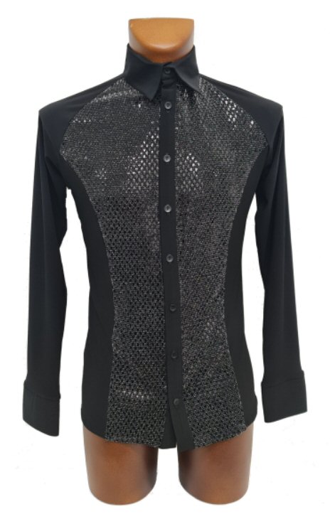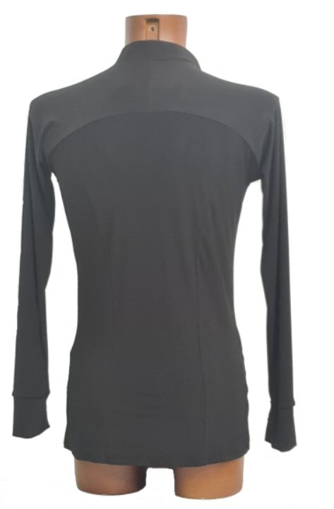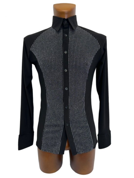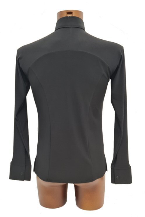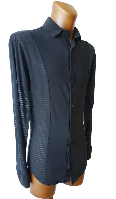 Raglan cut latin shirt made of stretchy velvet stripe fabric. Single cuff with button. Black. |