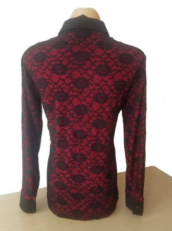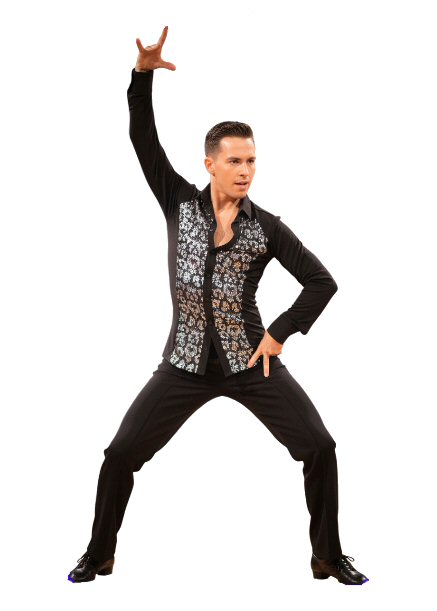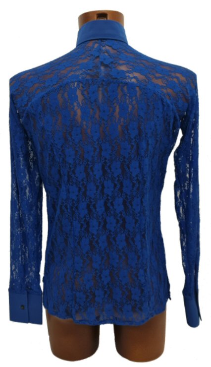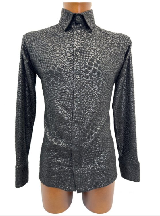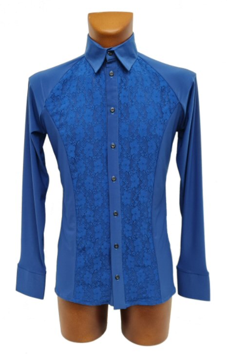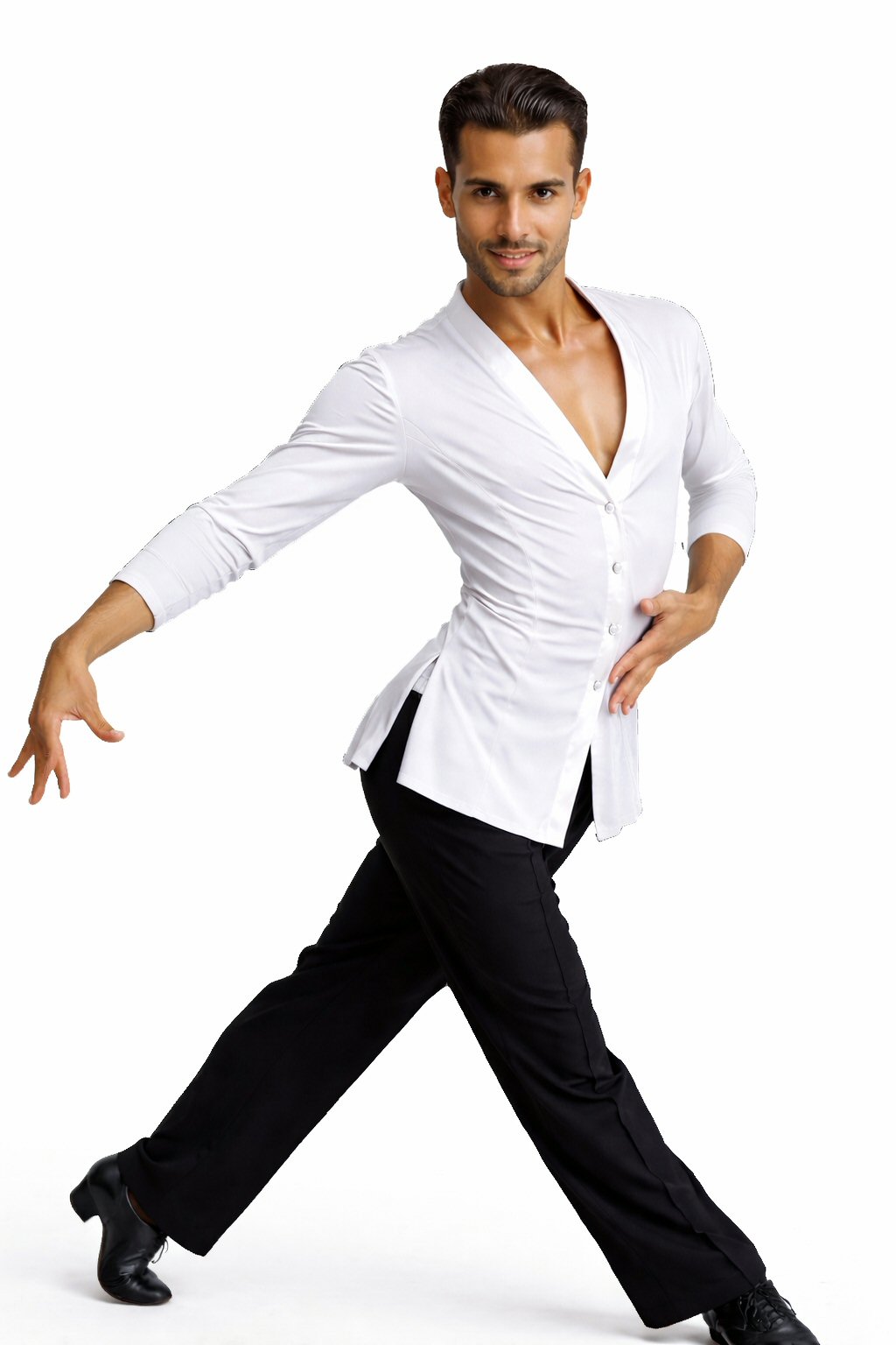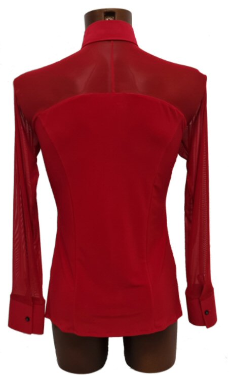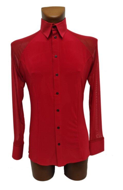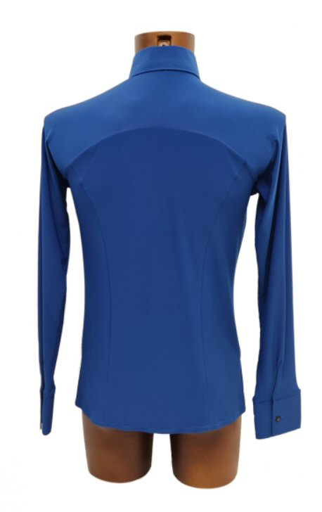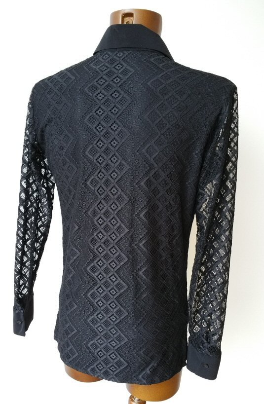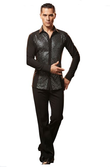Raglan cut latin shirt made of stretchy velvet stripe fabric. Single cuff with button. Black. |