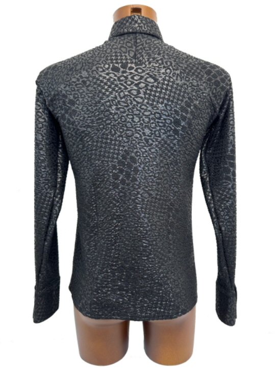 Silver Sparkle Pinstripe Raglan cut, stretchy shirt. Single cuff with button. Black. |
