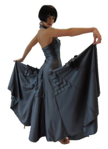 This soft and body friendly dress is made of stretch jersey with mesh godets finished with contrasting colour satin edging on multi-layer hem. Your back is beautifully presented behind a single layer of mesh. However, if you prefer to use a normal bra we can put a flesh jersey lining under the mesh on the back making the back completely not see-through.