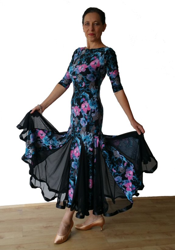 Floral print Ballroom dress with black net godets Floral print Ballroom dress with black net godets