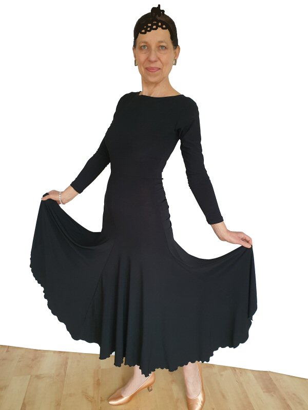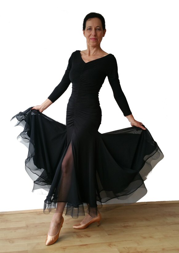 Lovely and feminine ballroom dress with eight net godets. Soft, body friendly stretch crepe. The sleeve an be long, 3/4 length, short or no sleeve. Various colours possible.
