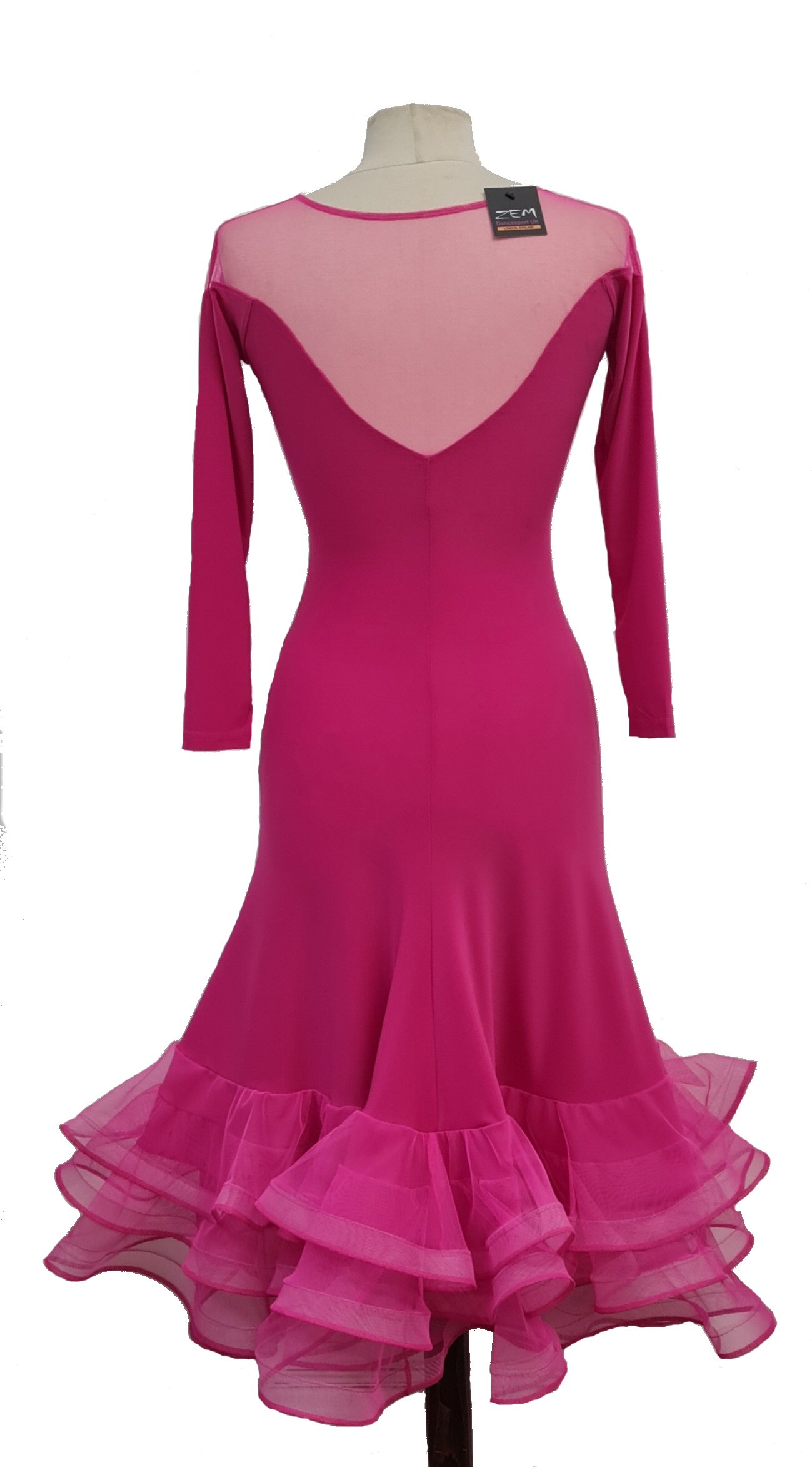 This superb open back panel dress has 12 vertical rows of mesh frills, which give it a lovely Ballroom style fullness. Although it is a lot of frills, this dress is very light, as the mesh fabric is very light. Sleeves are finished with middle finger loops. The dress is made in our usual two way stretch, soft dance crepe.