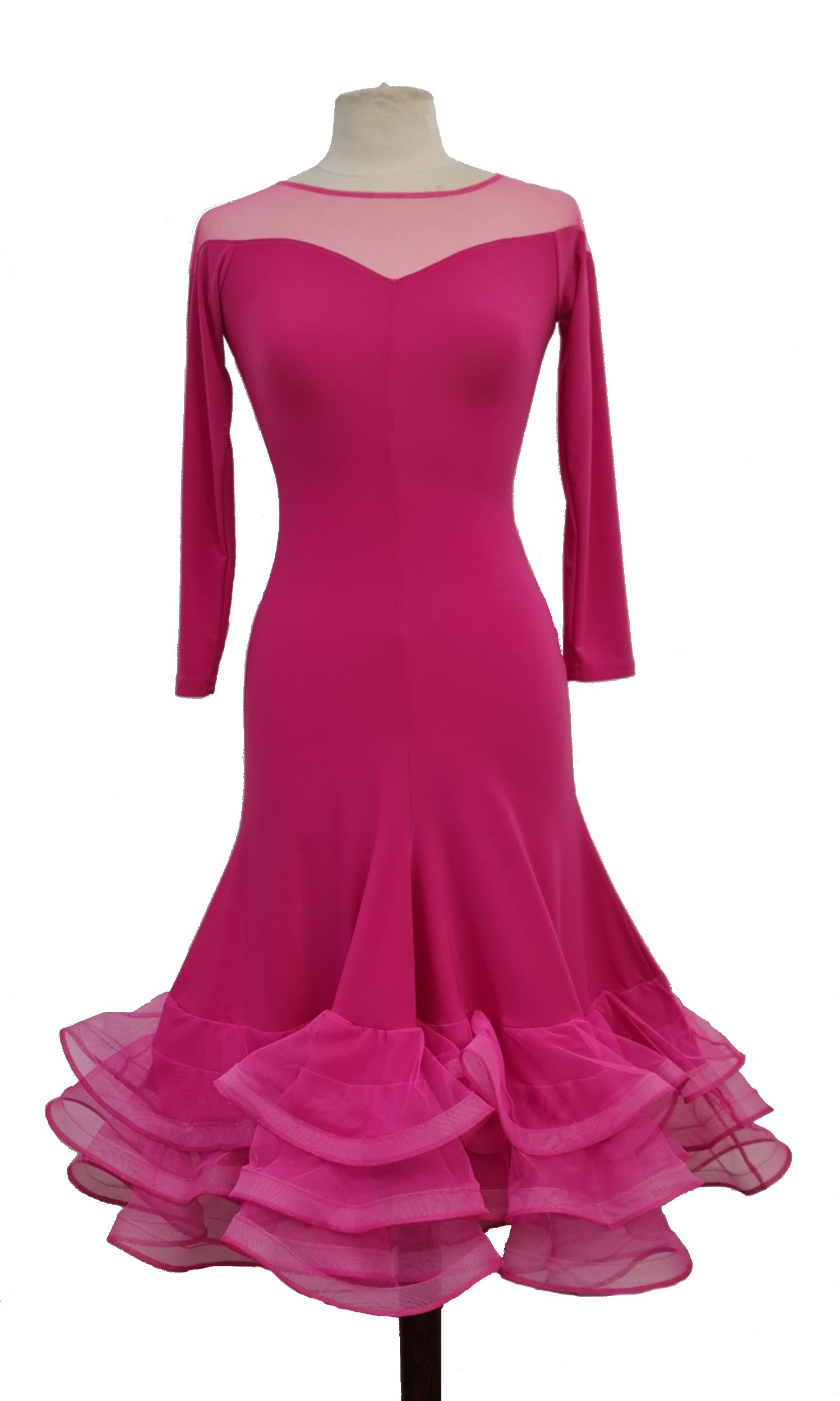 This superb panel dress has 12 vertical rows of mesh frills, which give it a lovely Ballroom style fullness. Although it is a lot of frills, this dress is very light, as the mesh fabric is very light. Sleeves are finished with middle finger loops. The dress is made in our usual two way stretch, soft dance crepe.