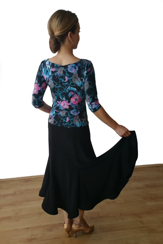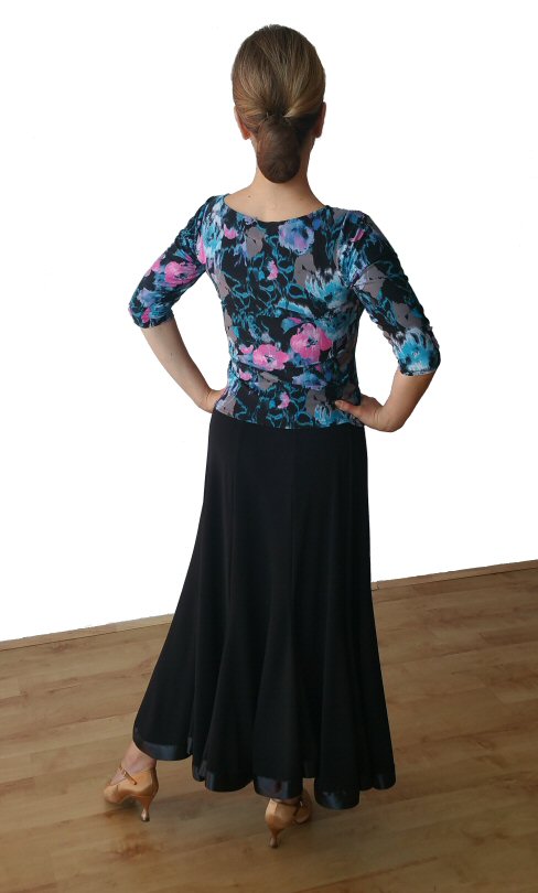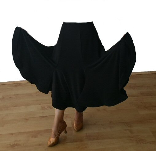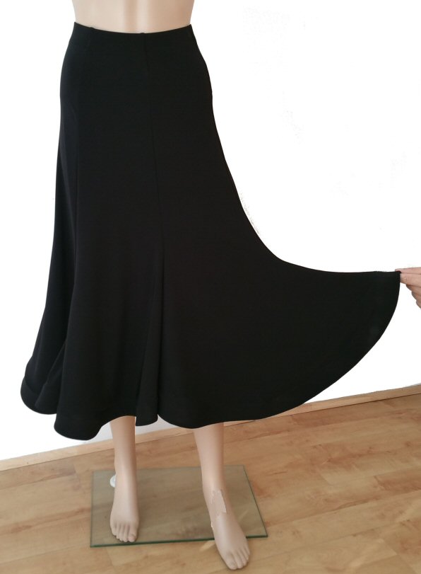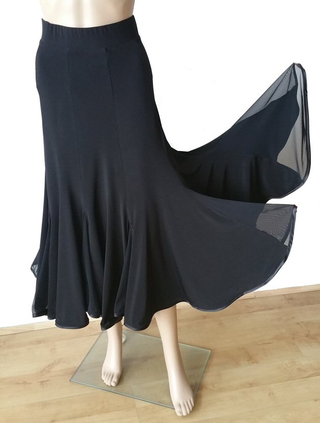 Magnificent flow ballroom skirt made of four panels and finished with mesh. Body friendly stretch crepe. Very easy care: Machine washable, dries quickly and does not require iroining. Does not crease.
