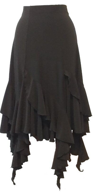 Eight panel ballroom skirt. Each panels comes with an additional curved shape frill, which creates a very "full" look. Made in stretch crepe with elasticated waist.