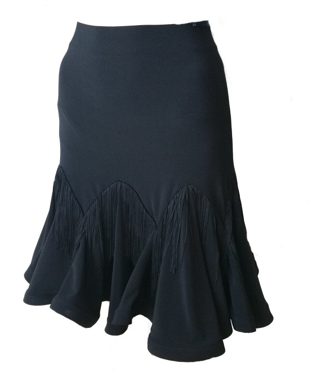 Knee length skirt with crinoline hem will be great for Salsa, Latin and other styles. The skirt is made in very stretchy, soft black crepe and comes with shaded Black/White fringe scattered in 8 places around on semi-circle godets. Elasticated waist.