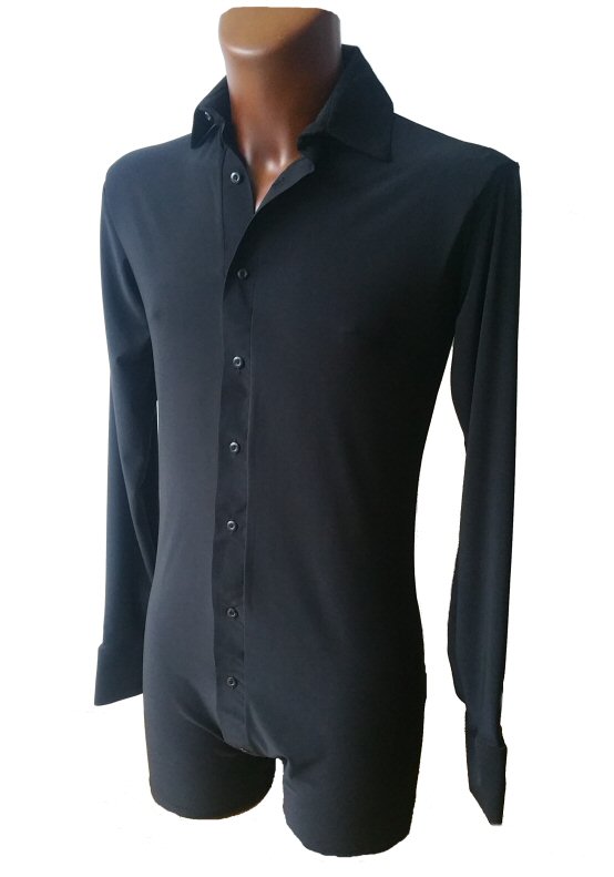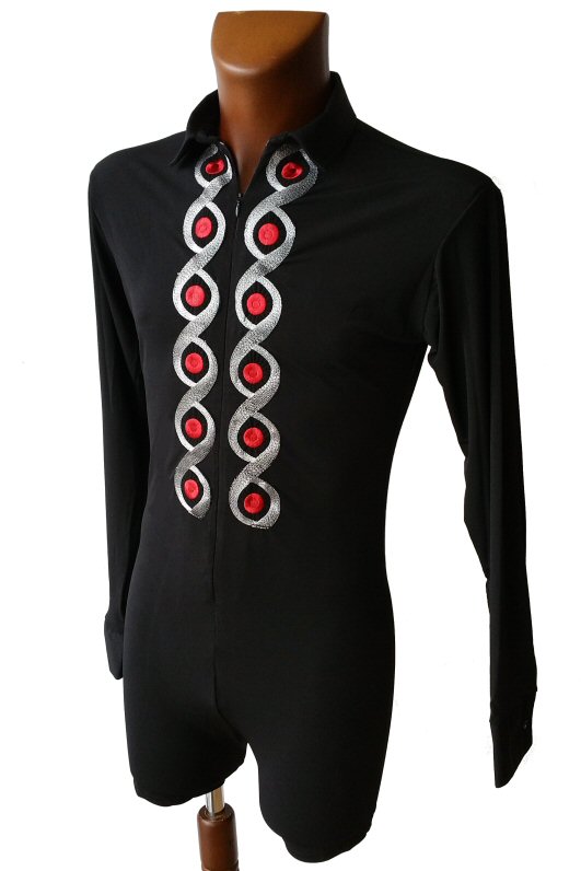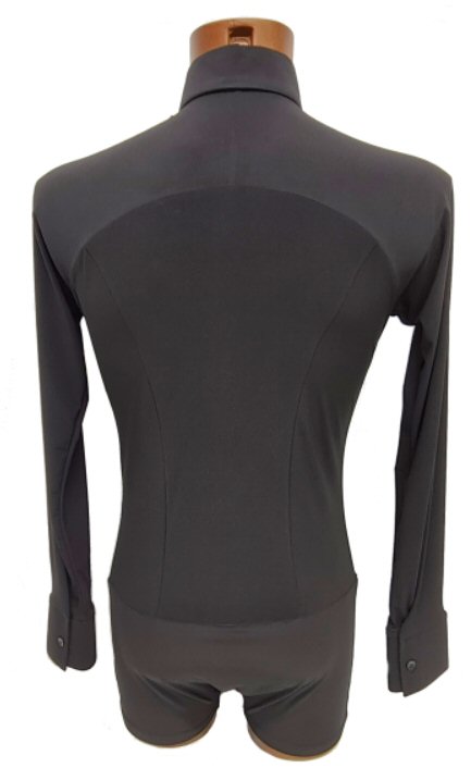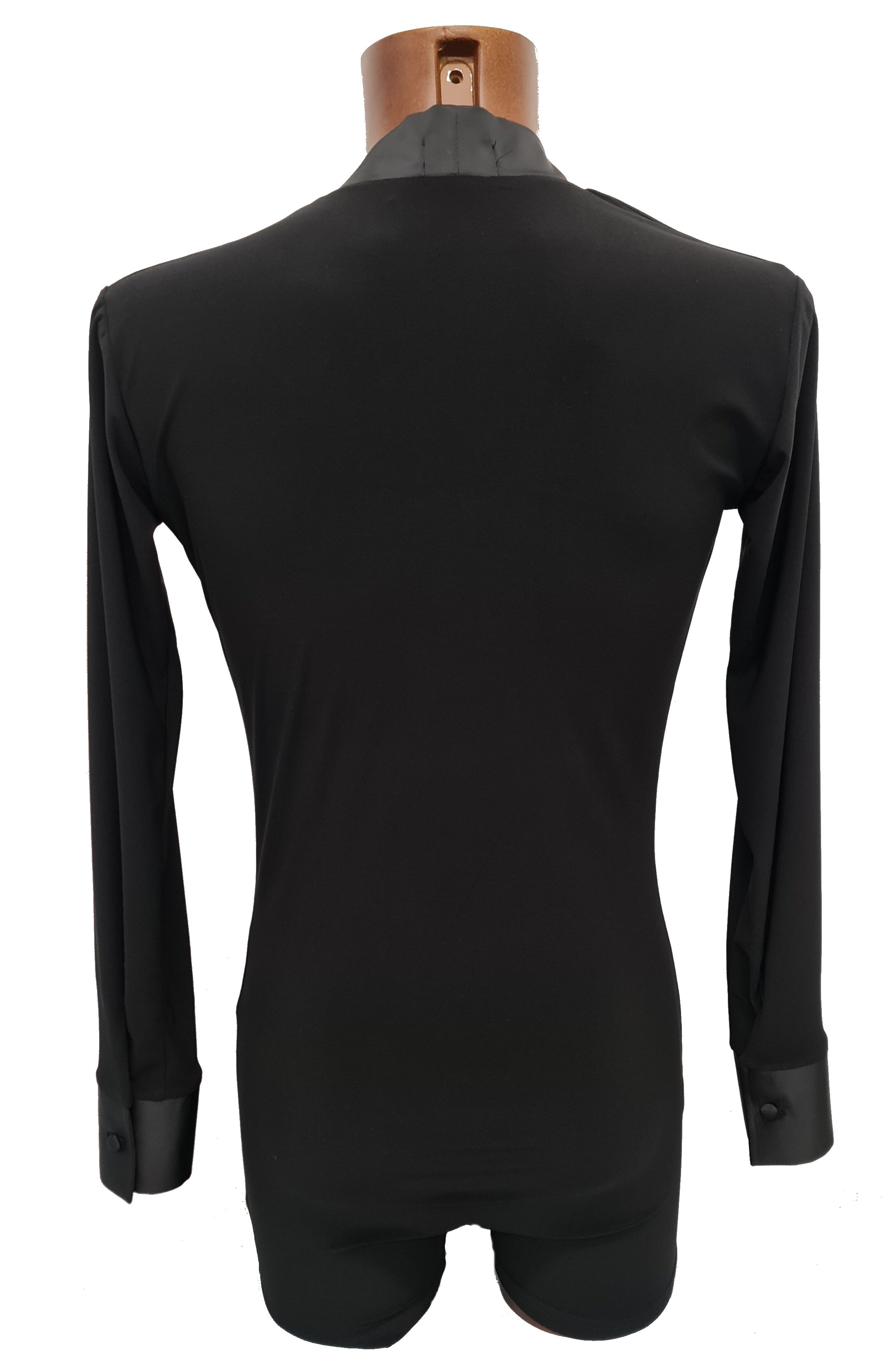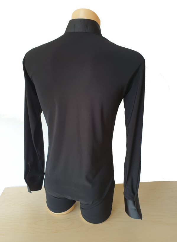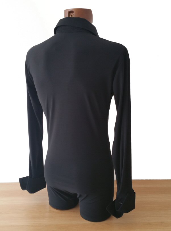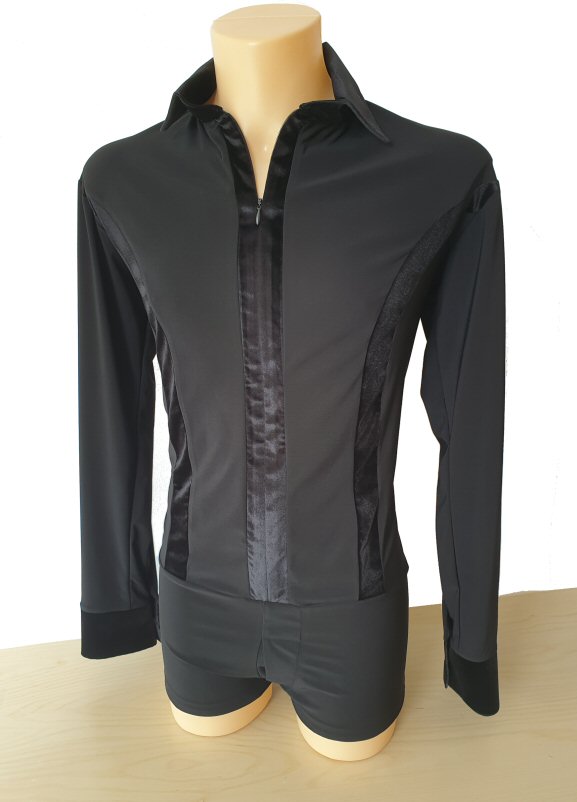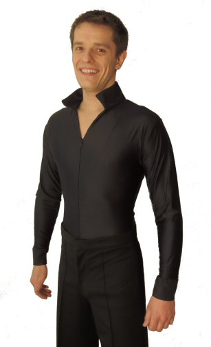 This latin body shirt is made of two fabrics: Stretch jersey and stretch satin. Masculine style collar. Zip at front allows you to have a V-neck as large as you like.