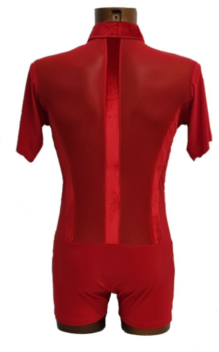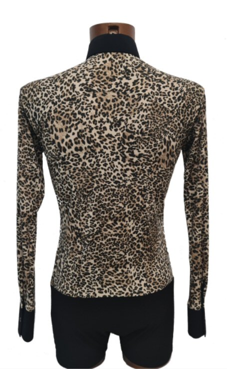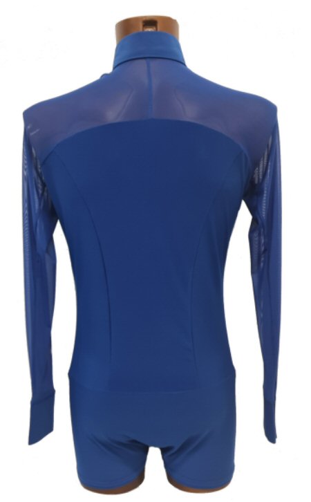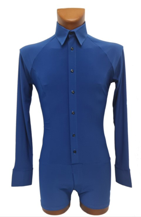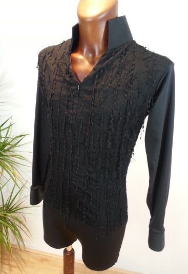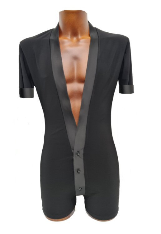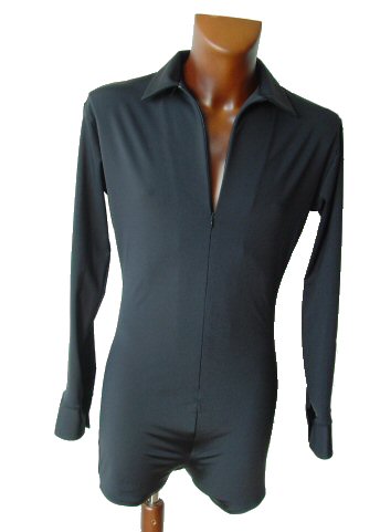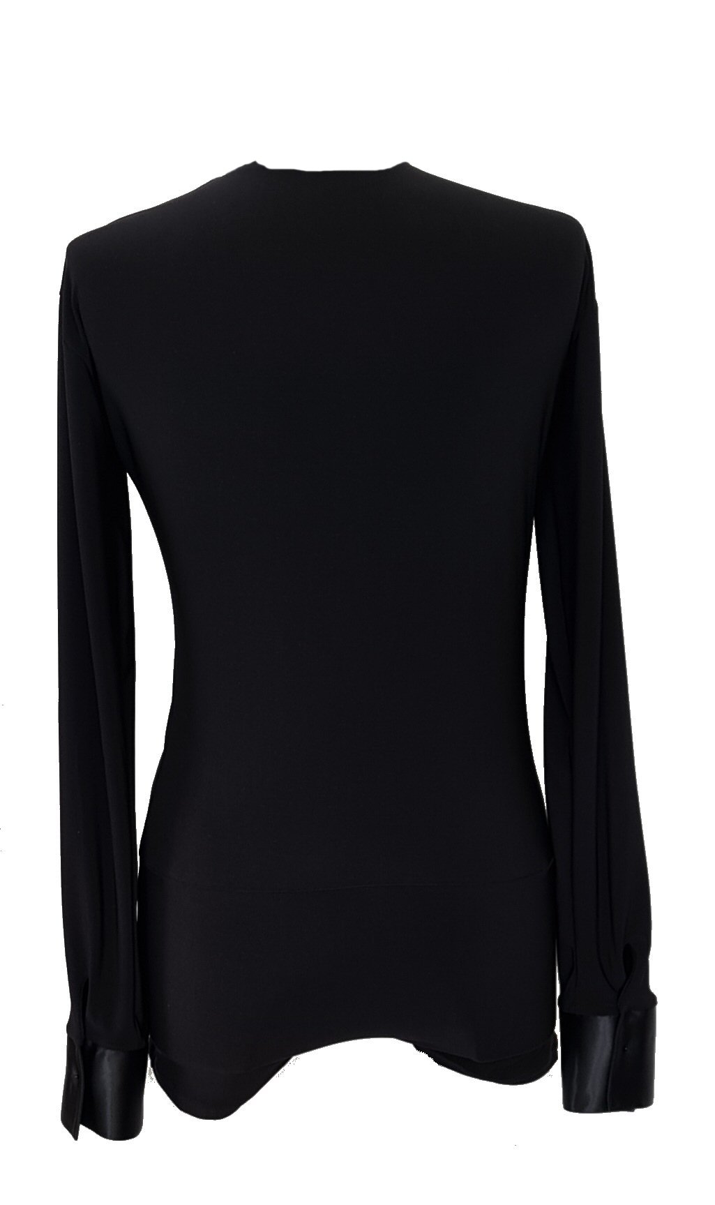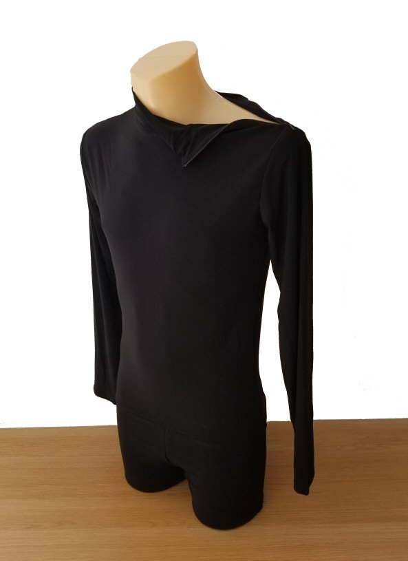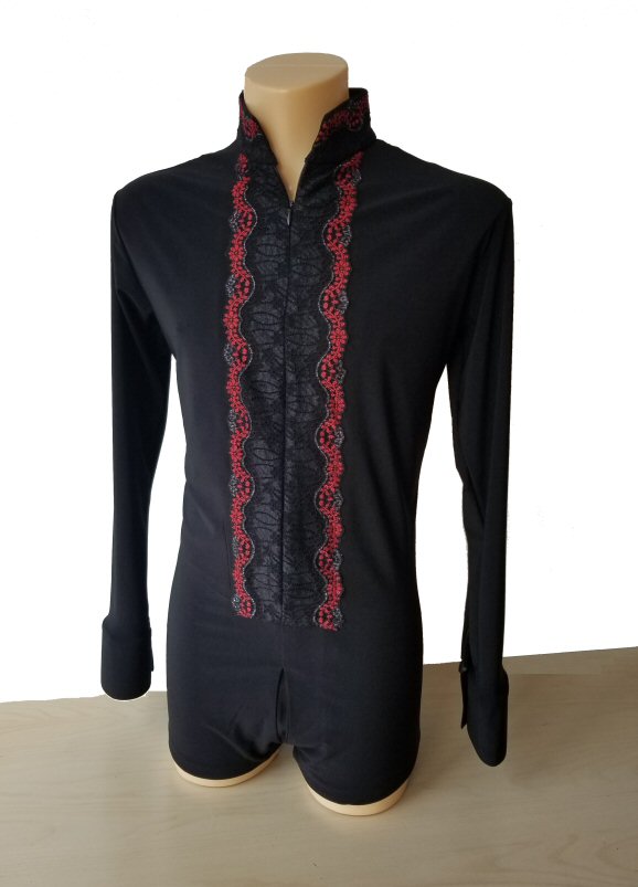 This latin body shirt is made of two fabrics: Stretch jersey and stretch satin. Masculine style collar. Zip at front allows you to have a V-neck as large as you like.