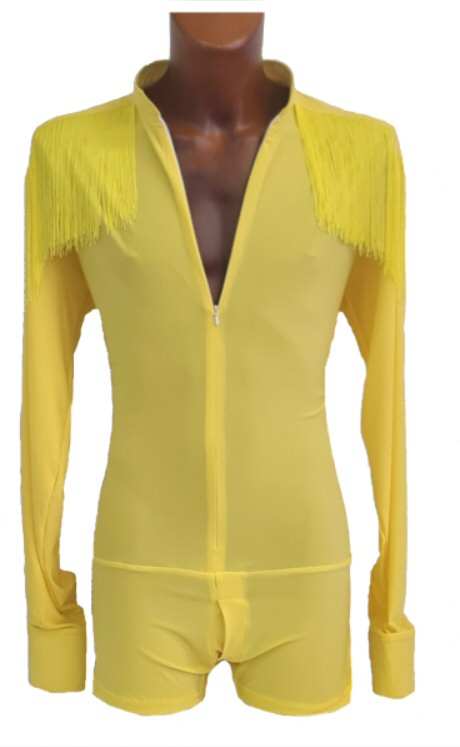 V-neck open chest Latin shirt on shorts Black with yellow trim V-neck open chest Latin shirt on shorts. Black with yellow trim