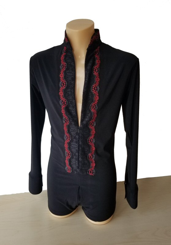 All stretch lace Long V-neck Latin shirt built on boxer shorts, which will never pull out of your trousers. Satin edging around V-neck line and cuffs. Single cuff with button. In this design the collar size is not relevant, sizing goes by chest size.