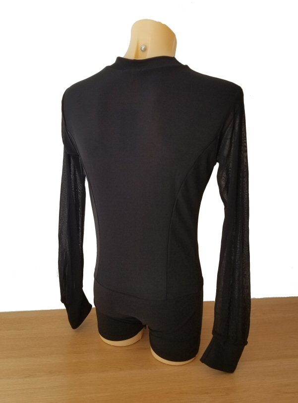 Two way stretch black mesh. With a small stand-up collar. We also make this shirt with a traditional collar, see previous item E-MS236C.