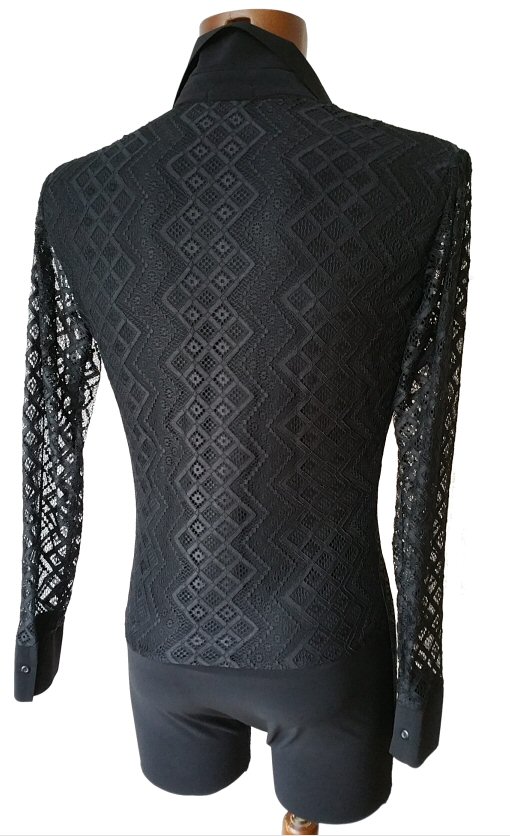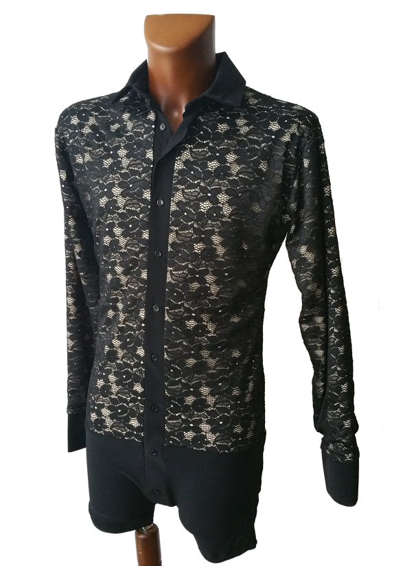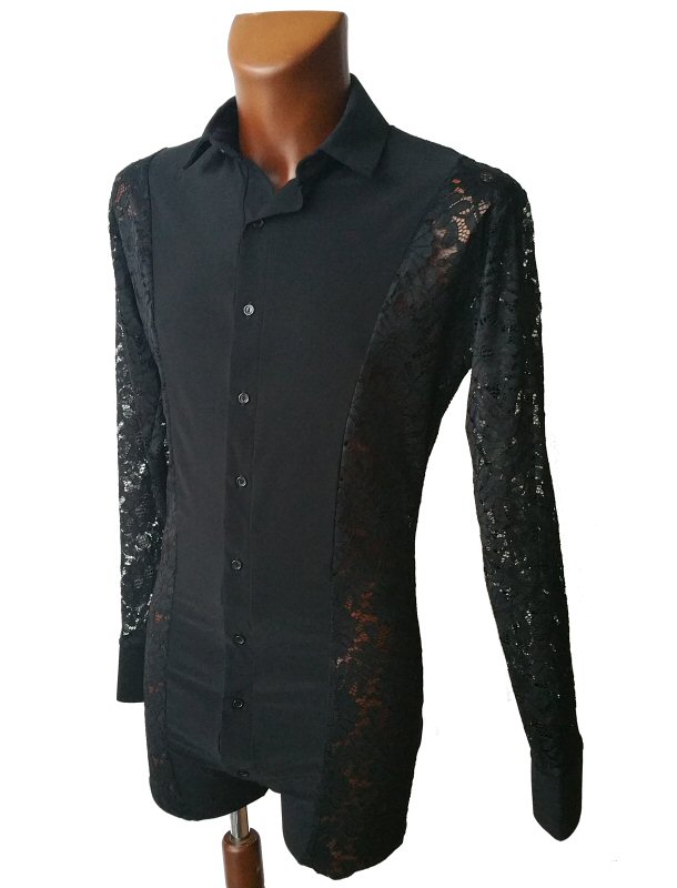 Semi-see through lace fabric on the sleeves, the back and body sides. Solid black stretch crepe on the front. Traditional collar, buttons and button cuffs. The collar size goes in proportion with the body size and it is slightly larger, but this type of shirt is best worn with top button open, so you do not need an exact collar size. This shirt is built on boxer shorts, so it will never pull out of your trousers.