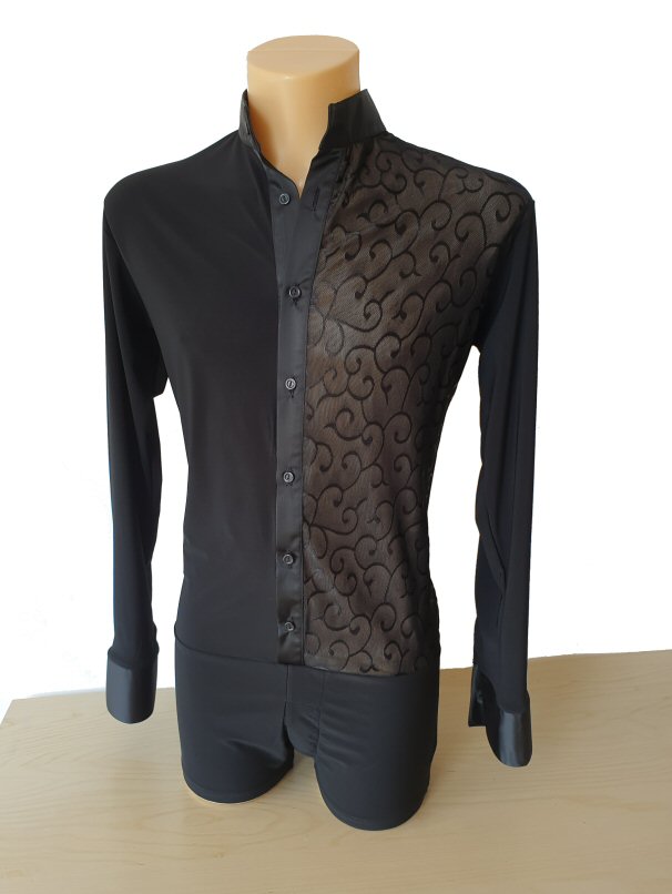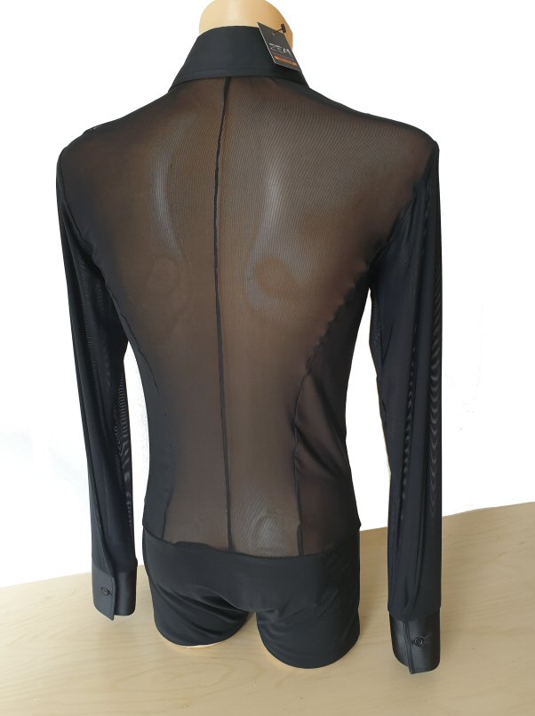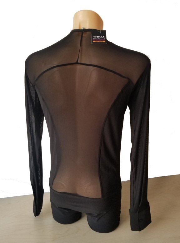 Latin body shirt made in strethy flocked net, A layer of flock net is on flesh mesh lining, so the shirt is not see-through, althought it gives an illusion of being see-through. Single cuff with button.