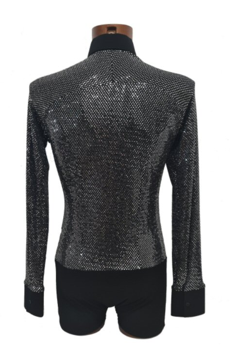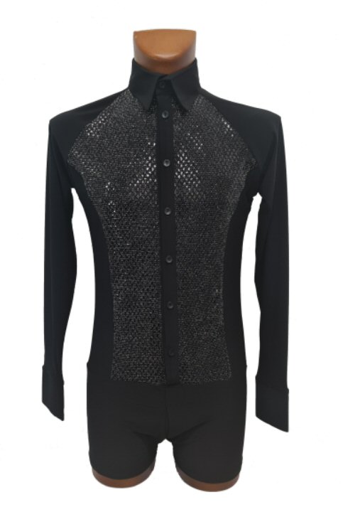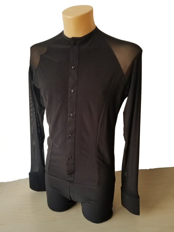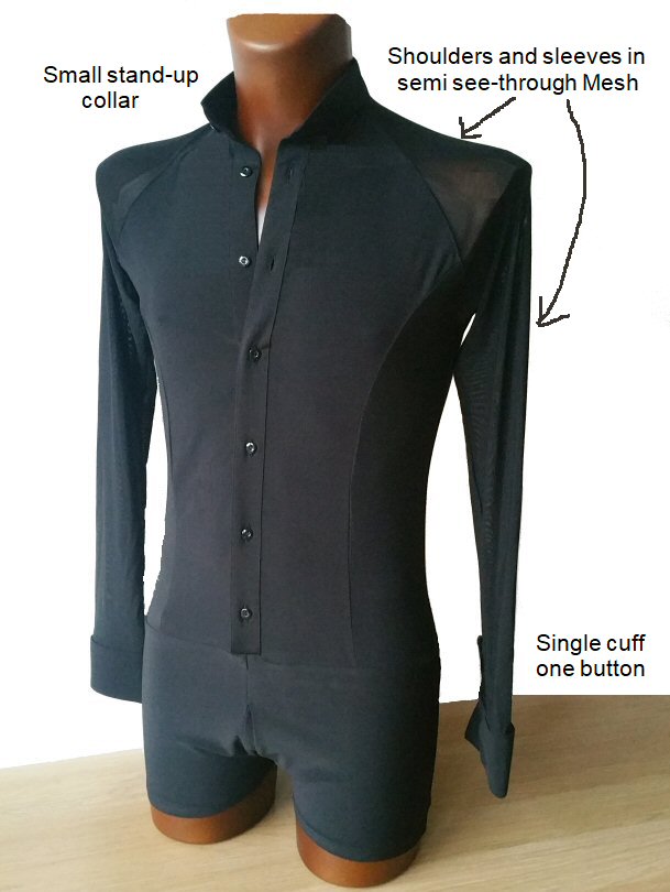 Stretch mens style latin body shirt, which will also work well for a female dancer dancing a mens role. A layer of flock net is on flesh mesh lining, so the shirt is not see-through, althought it gives an illusion of being see-through. Single cuff with button.