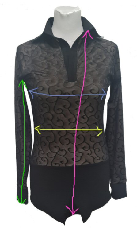 Back of Mens Latin body shirt for a female dancer Measurements for Mens Latin body shirt for female dancer