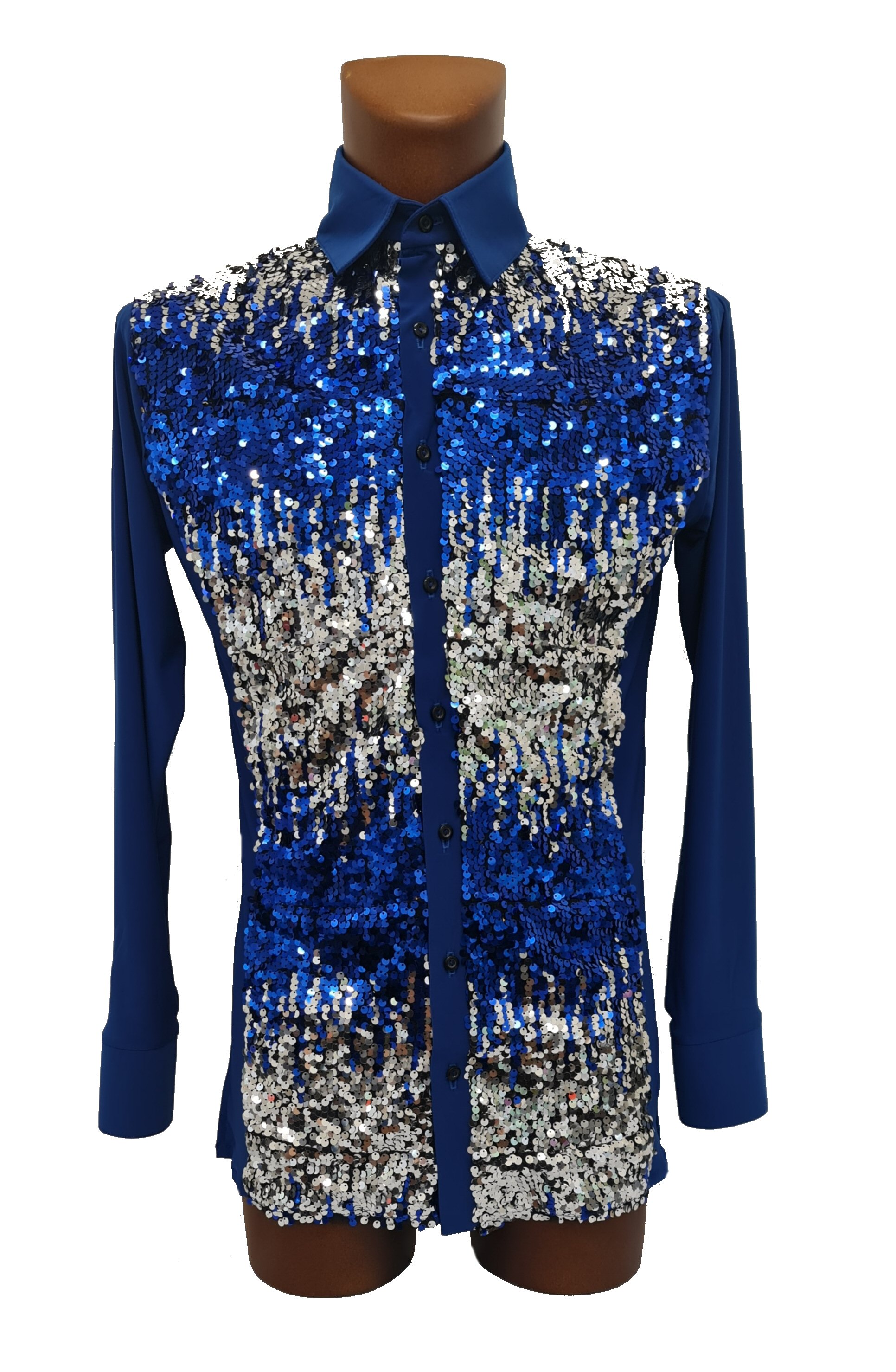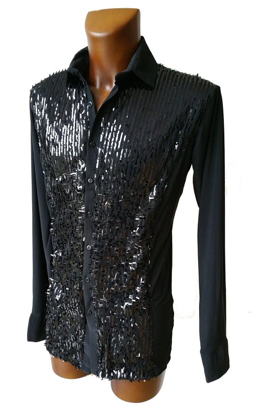 Soft, two way stretch crepe shirt with shiny sequin at the front. Traditional collar and buttons. This is a shirt only, with no underpants. Under the sequin fabric there is a lining of soft jersey, so it will not irritate your skin. Available from Xtra Small to Xtra Large, but it can also be Custom made to your size. Just select "custom size" in the size selection box and send us your measurements: collar size, chest size, waist size, length of sleeve measured from armpit to wrist.