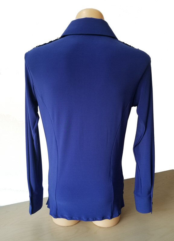 Stretchy Gypsy style shirt with silver/grey sequin motif on the front. Single cuff with button. The shirt on the photo is shown with a standup collar, but we can also make it with a traditional collar. Hand washing recommended.