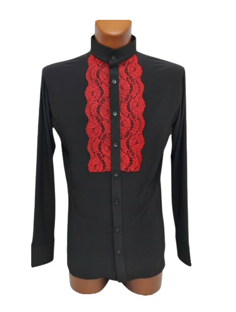 Stretchy Flamenco style shirt with lace front. Single cuff with button. The shirt on the photo is shown with a standup collar, but we can also make it with a traditional collar. Machine washable, dries quickly and does not require ironing.