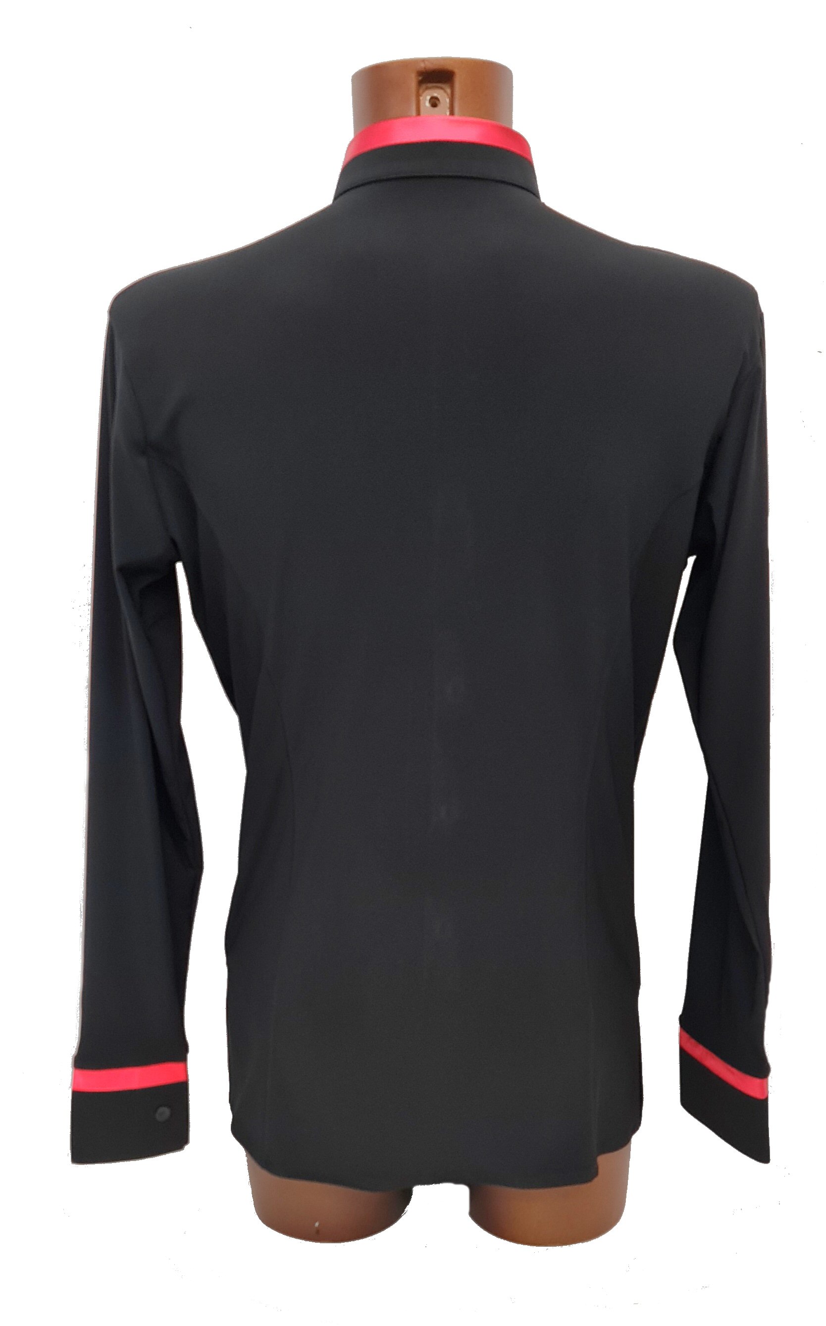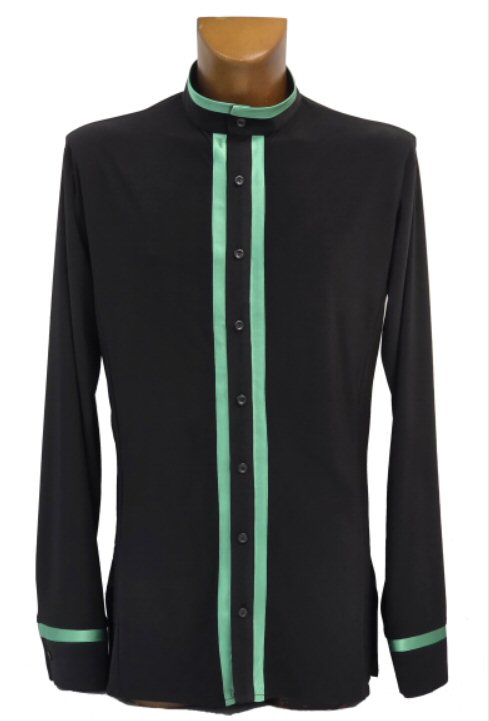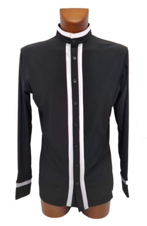 Cool shirt for Latin or show dance with contrasting satin trim. Button fastening. Single cuff with button. Easy care: Machine washable, dries quickly and does not require ironing.