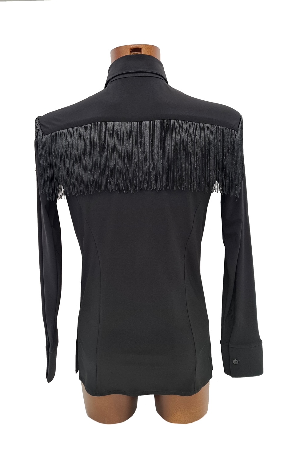 Soft, body friendly stretch crepe. Black fringe on shoulders with traditional collar. Single cuff. Button fastening. |