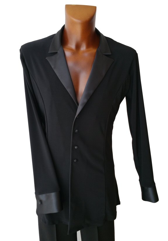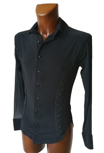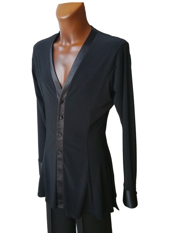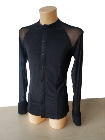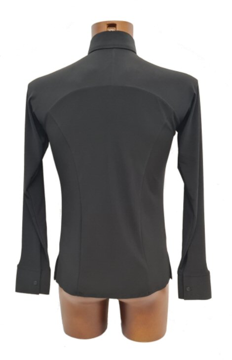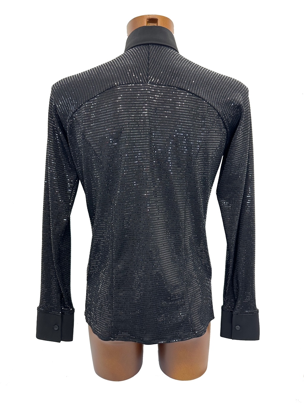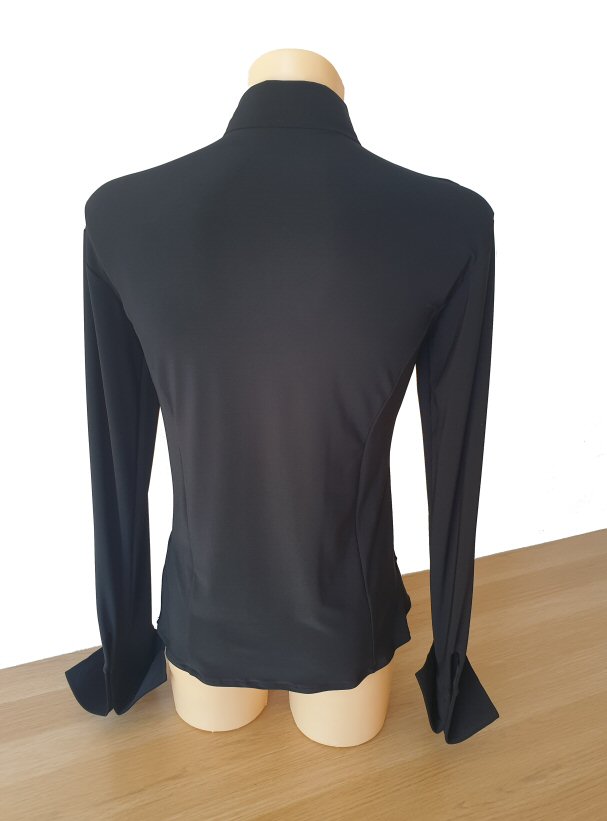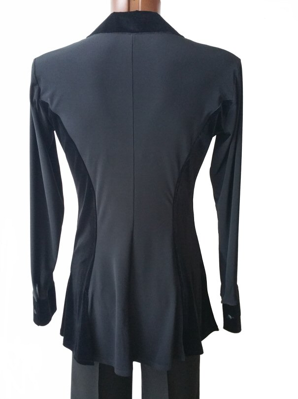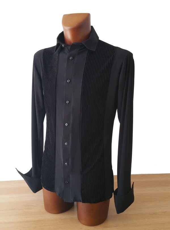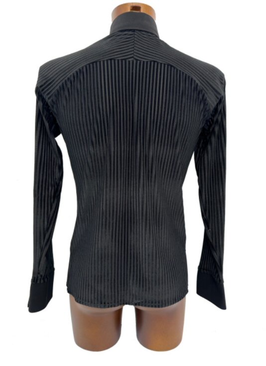 Raglan cut latin shirt made of stretchy velvet stripe fabric. Single cuff with button. Black. |