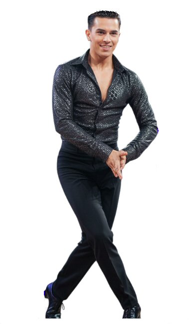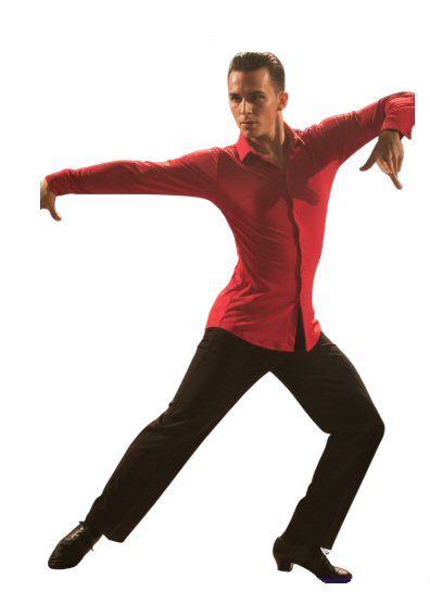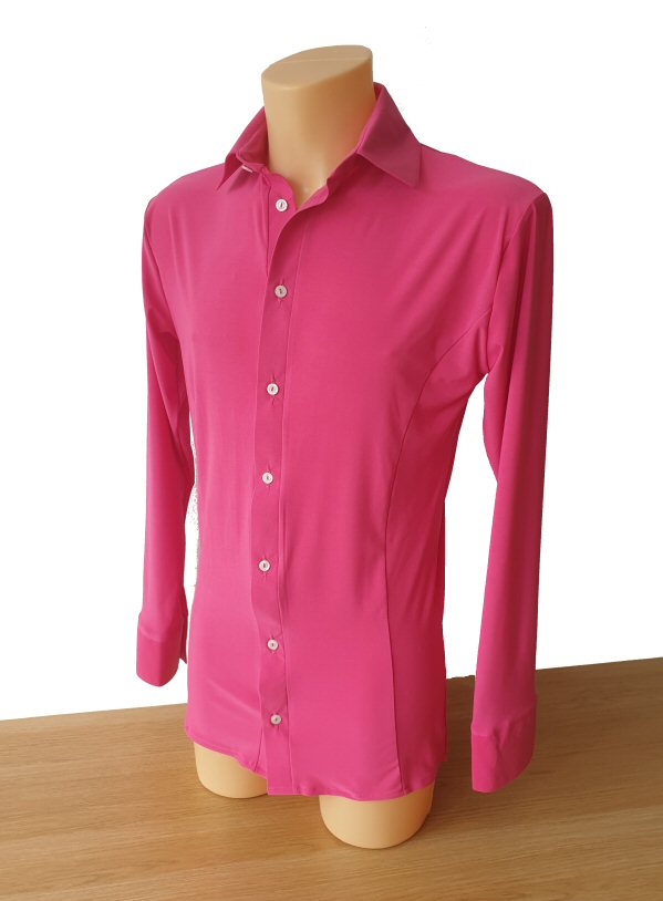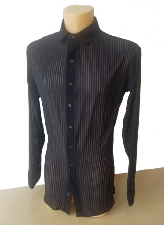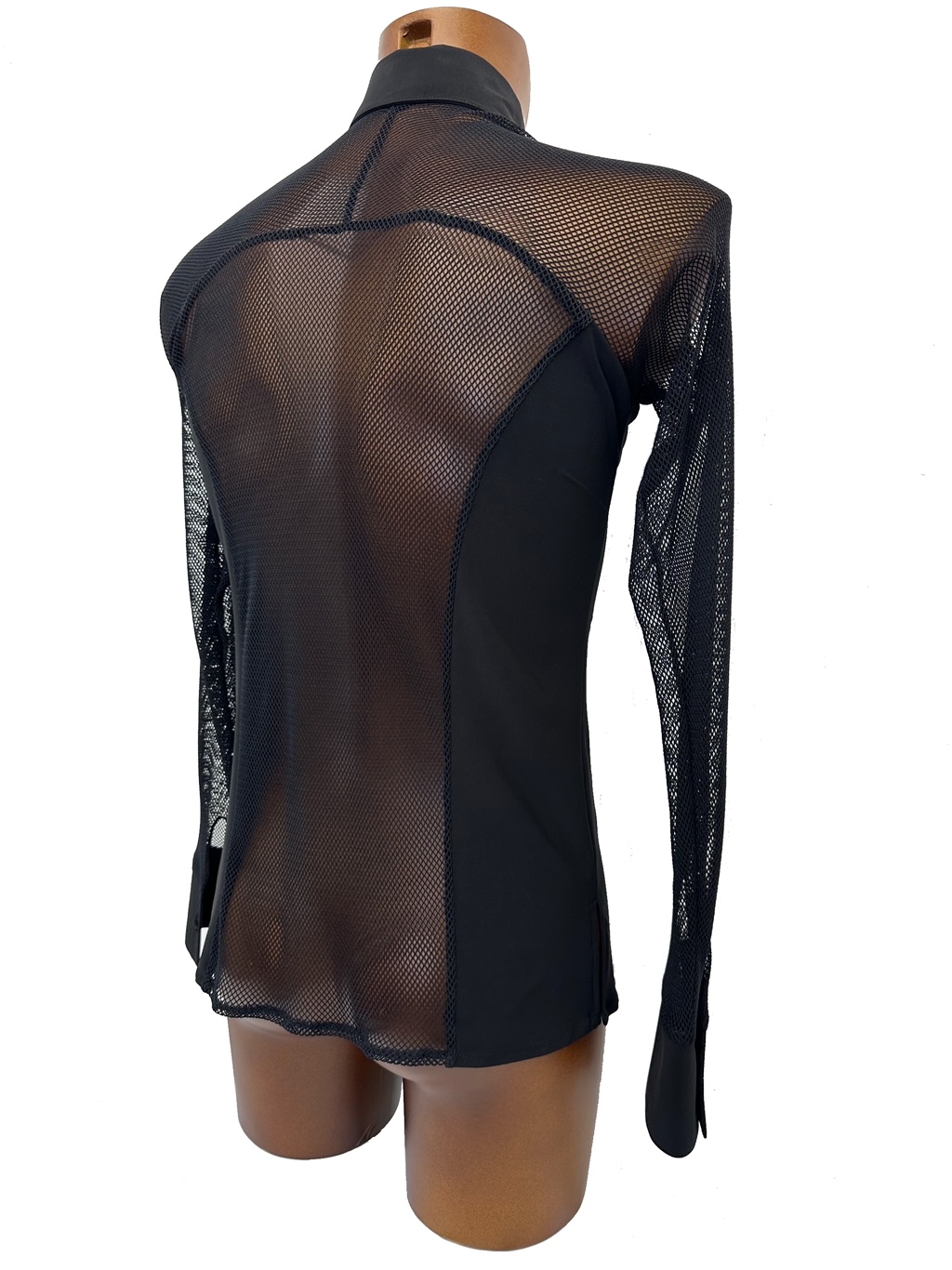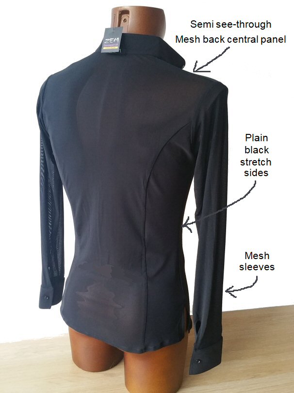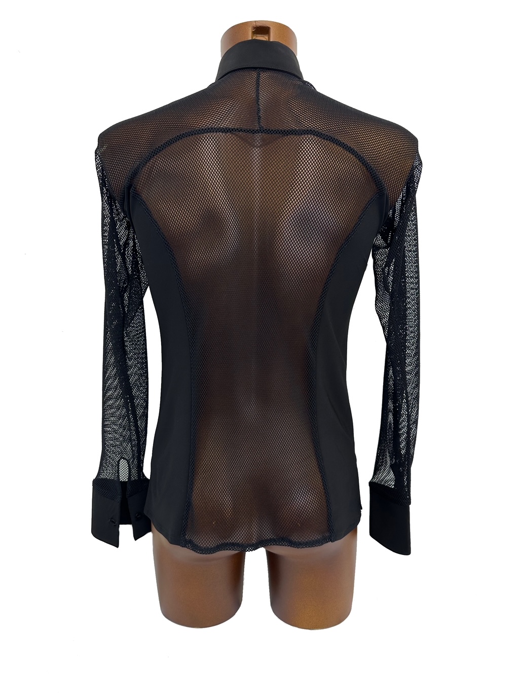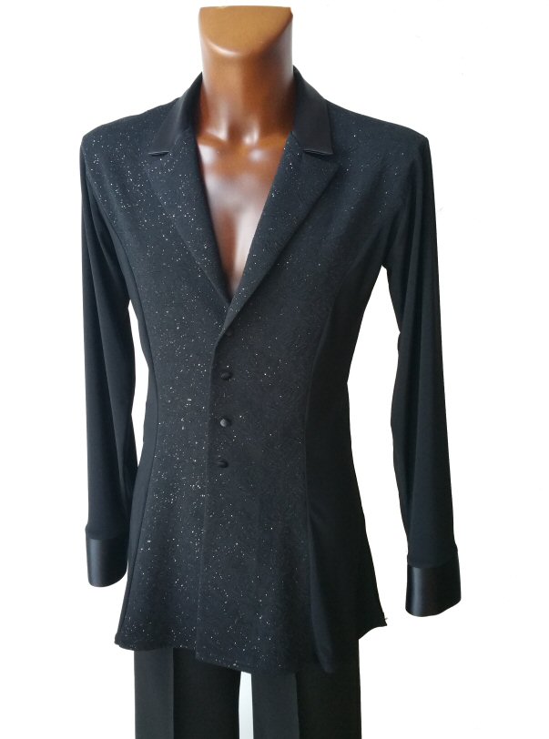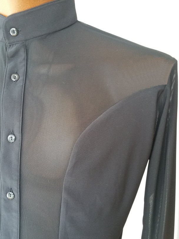 Raglan cut latin shirt made of stretchy velvet stripe fabric. Single cuff with button. Black. |