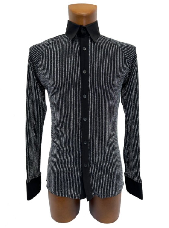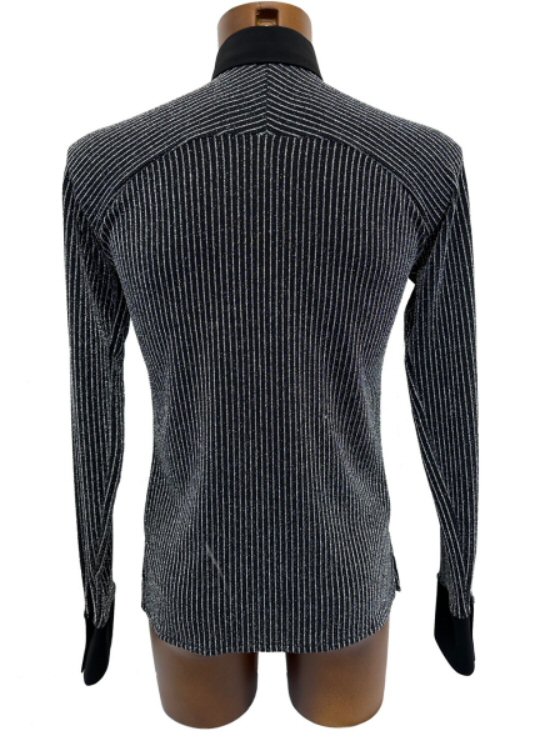 Silver Sparkle Pinstripe Raglan cut, stretchy shirt. Single cuff with button. Black. |